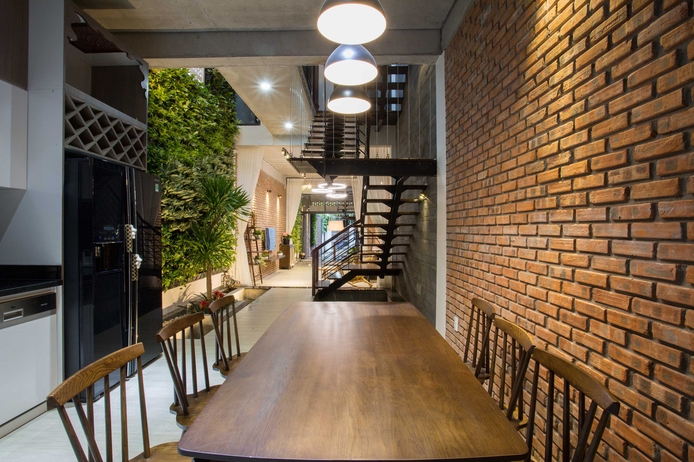 - Khu vực đặt cầu thang đồng thời cũng là giếng trời. Những bức tường bên cạnh cầu thang được biến thành khu vườn thẳng đứng, thông suốt từ tầng một lên mái.